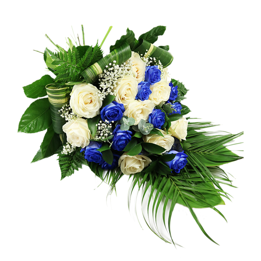 Express your deepest sympathies with our harmoniously arranged bouquet of white and blue roses, designed to offer peace and solace.